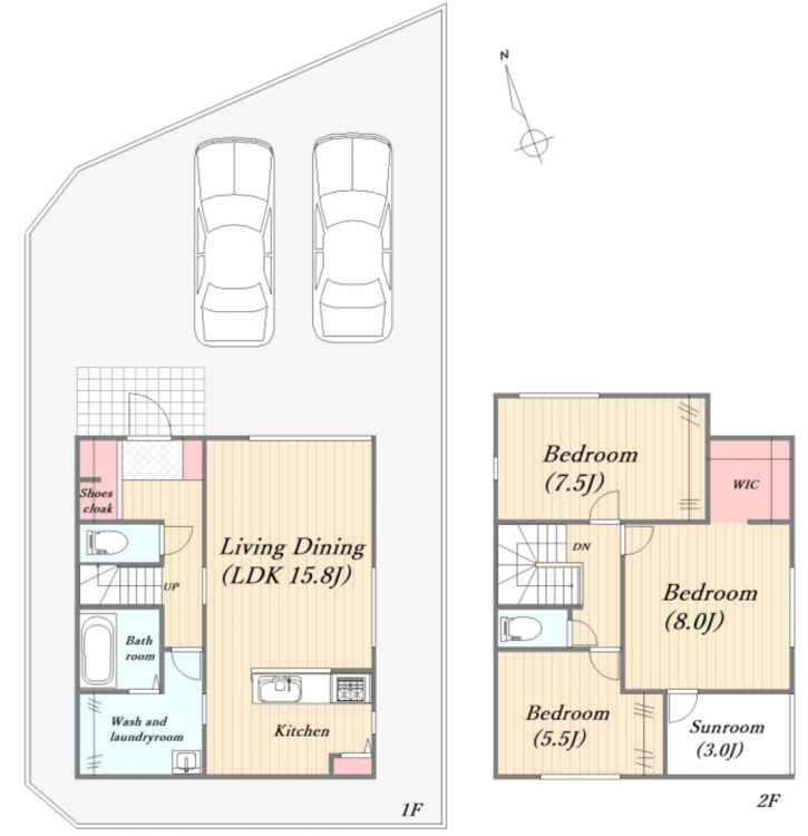 - オール電化、システムキッチン、IHクッキングヒーター、食器洗浄乾燥機、シャンプードレッサー、モニタ付インターホン、ウォークインクローゼット、駐車場2台分、床下収納、トイレ2箇所、シューズクローク、サンルーム、パントリー、スマートキー