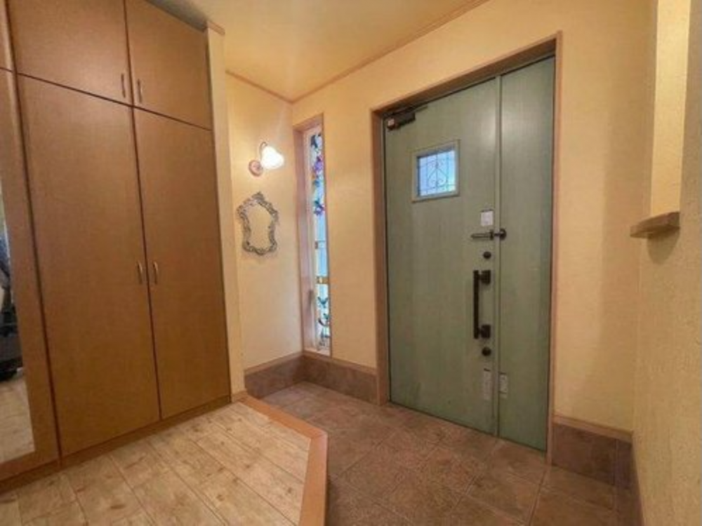玄関はゆとりある広さで、来客時にも余裕を持って対応できる空間設計。大型のシューズ収納を備え、家族分の靴もしっかり整理できます。採光窓やデザイン性のある建具が印象的で、住まいの第一印象を上質に演出。