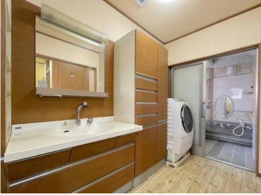 洗面室は収納力のある大型洗面化粧台を採用し、日用品やタオル類もすっきり整理可能。室内洗濯機置場も確保されており、家事動線も良好です。浴室へのアクセスもスムーズで、毎日の身支度が快適に行えます。