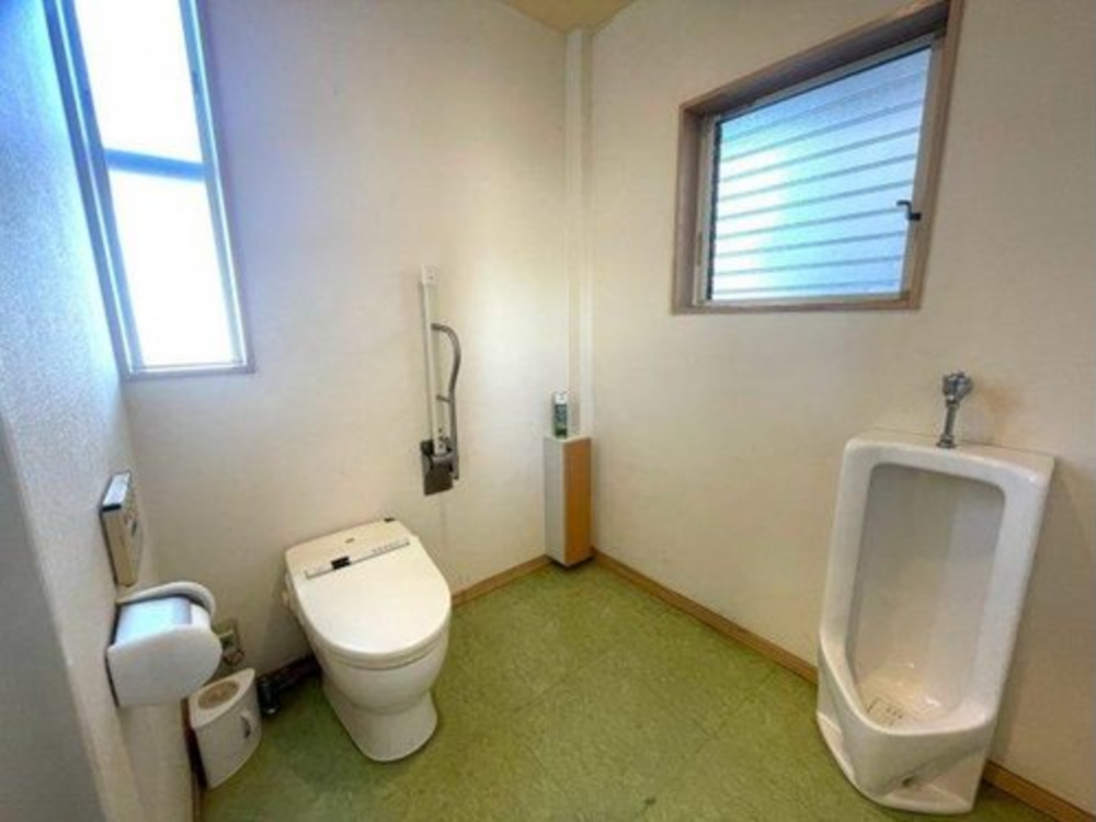 洋式トイレに加え小便器も設置されており、来院者や来客にも使いやすい設備となっています。手すりも設置されており、利用者に配慮したつくりとなっています。クリニックや事業用施設としても利用可能なトイレです。